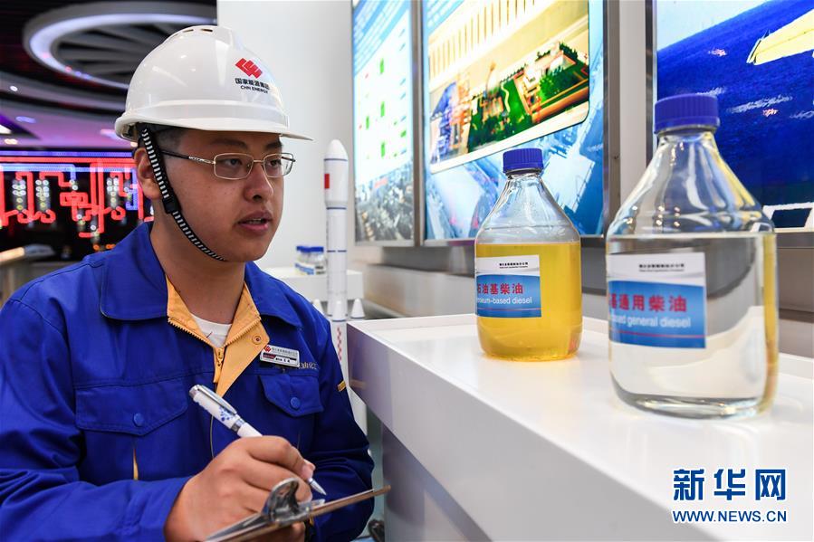 在国家能源集团鄂尔多斯煤制油分公司展厅,一名工作人员观察记录长时间放置的两瓶柴油的性状。左为市场销售柴油,右为煤直接液化产品(4月12日摄)。新华社记者 刘磊 摄