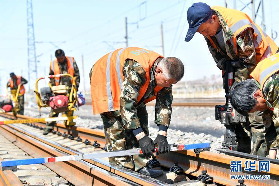 大同工务段的工人们在检查线路轨距(4月16日摄)。 近日,大秦铁路进入春季检修阶段,中国铁路太原局集团有限公司大同工务段的工人们加紧施工,确保列车的安全运行。 每年春、秋两季,大秦铁路都会迎来为期25天左右的“体检”。“体检”期间,全线路每天停运3小时,工人会进行更换伤损钢轨、夯实道床、清理淤积物等20余项施工作业。 大秦铁路西起大同韩家岭,东至秦皇岛柳村南,全长653公里,煤炭运量占全国铁路煤运总量的近1/5,是中国铁路重载领域的标志性工程。 新华社记者 曹阳 摄