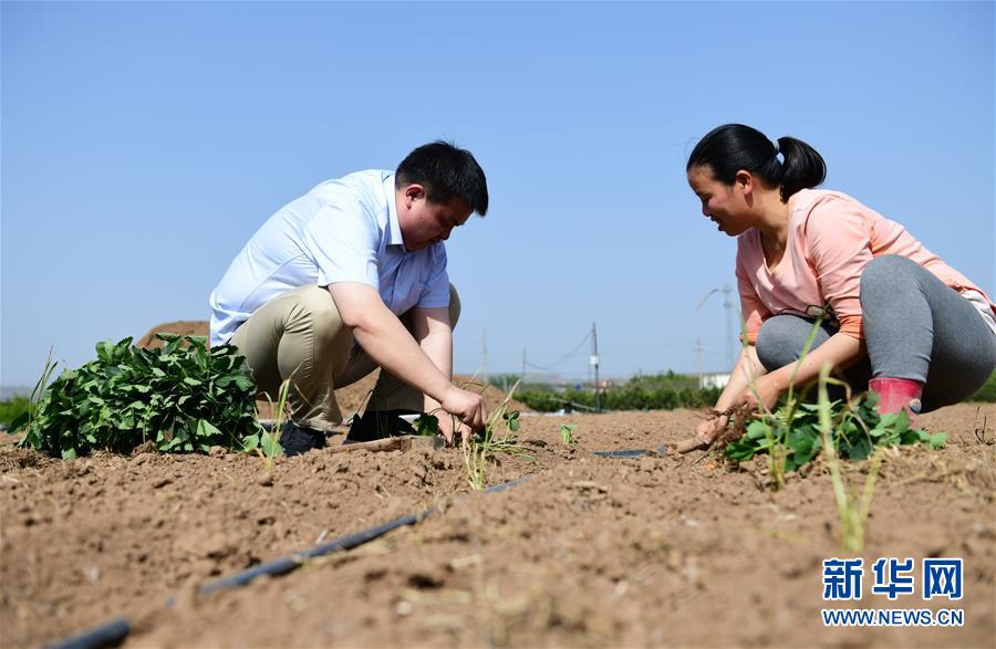4月16日,宋博(左)和草莓青创农场的工人一同种植草莓苗。