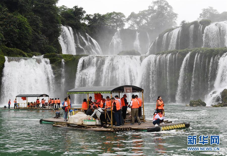 4月17日,游客乘坐竹筏在大新县德天瀑布景区游览。