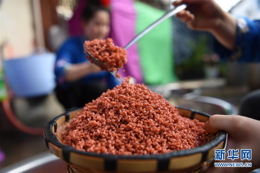 4月16日,在贵州省台江县姊妹街哆蝶五彩姊妹饭体验店,苗家妇女展示制作五彩“姊妹饭”的糯米。新华社发(刘开福 摄)