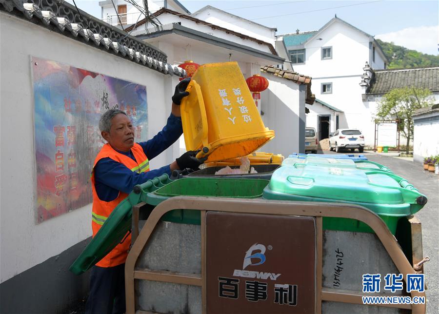 4月17日, 广丰区东阳乡龙溪村垃圾转运员在收集住户门前垃圾桶的垃圾。2019年以来,江西省上饶市广丰区东阳乡加大垃圾分类试点推进力度。在东阳乡管村、龙溪村、竹岩村、湖口村、苏溪村等地,家家户户门前摆放着装可腐烂与不可腐烂垃圾的两色垃圾桶,农户每天将生活垃圾分类,由村集体指定的物业公司收集转运,可腐烂垃圾将统一进行堆肥处理,实现循环利用。农户还可将不可腐烂垃圾进一步分类,将其中可再利用的送到垃圾分类积分兑换处换取积分,积累积分换取日常用品。自从垃圾分类推行以来,东阳乡垃圾减量50%。新华社记者 彭昭之 摄