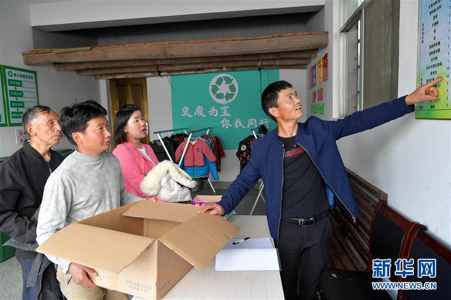 4月17日,村民将废旧衣物和纸箱送到广丰区东阳乡龙溪村垃圾分类积分兑换处。2019年以来,江西省上饶市广丰区东阳乡加大垃圾分类试点推进力度。在东阳乡管村、龙溪村、竹岩村、湖口村、苏溪村等地,家家户户门前摆放着装可腐烂与不可腐烂垃圾的两色垃圾桶,农户每天将生活垃圾分类,由村集体指定的物业公司收集转运,可腐烂垃圾将统一进行堆肥处理,实现循环利用。农户还可将不可腐烂垃圾进一步分类,将其中可再利用的送到垃圾分类积分兑换处换取积分,积累积分换取日常用品。自从垃圾分类推行以来,东阳乡垃圾减量50%。新华社记者 彭昭之 摄