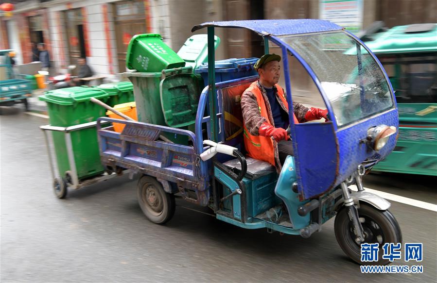 广丰区东阳乡竹岩村垃圾转运员在转运垃圾(4月16日摄)。2019年以来,江西省上饶市广丰区东阳乡加大垃圾分类试点推进力度。在东阳乡管村、龙溪村、竹岩村、湖口村、苏溪村等地,家家户户门前摆放着装可腐烂与不可腐烂垃圾的两色垃圾桶,农户每天将生活垃圾分类,由村集体指定的物业公司收集转运,可腐烂垃圾将统一进行堆肥处理,实现循环利用。农户还可将不可腐烂垃圾进一步分类,将其中可再利用的送到垃圾分类积分兑换处换取积分,积累积分换取日常用品。自从垃圾分类推行以来,东阳乡垃圾减量50%。新华社记者 彭昭之 摄