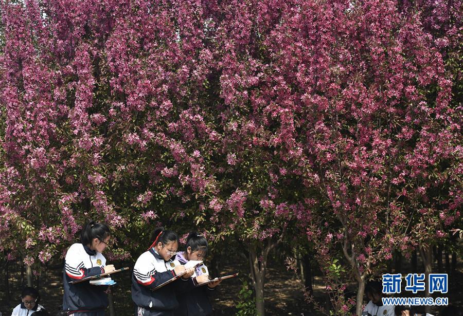 4月16日,山东省邹平市台子镇中学学生在沿黄高效生态农业示范区海棠基地写生。眼下正是齐鲁大地五彩缤纷的花开时节,农民花田劳作,游客花海徜徉,处处洋溢着浓浓春色。新华社发(董乃德 摄)
