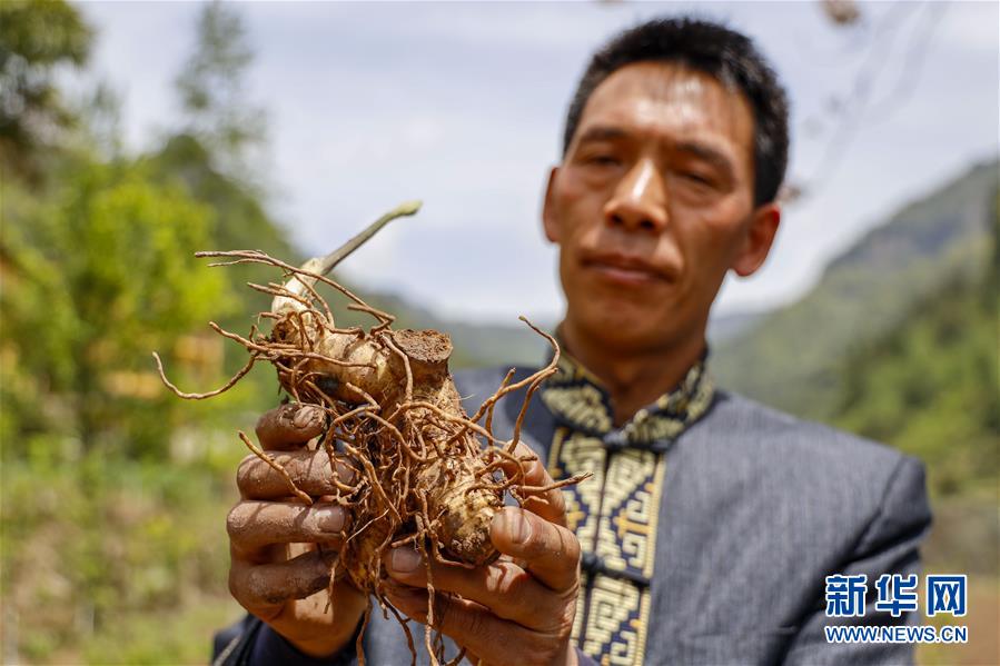 中益乡农民汪从兴展示种植的中药材黄精(4月16日摄)。新华社记者 刘潺 摄