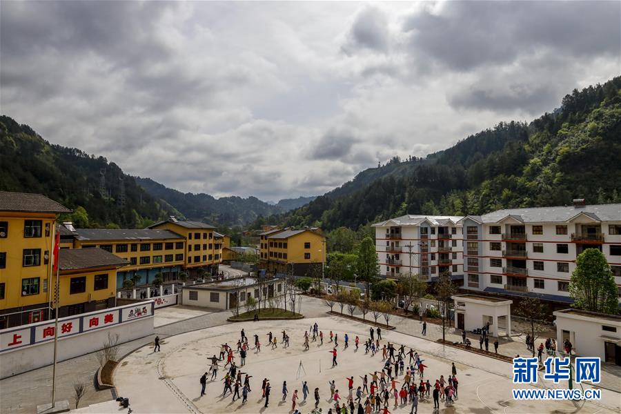 中益乡小学学生在课间操时间练习当地土家族传统舞蹈——摆手舞(4月16日摄)。新华社记者 刘潺 摄