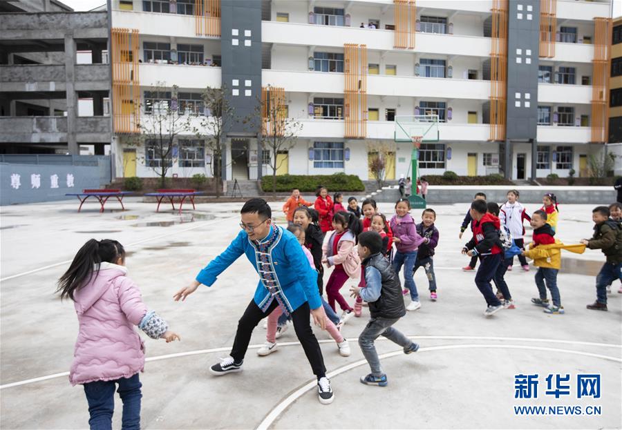 在中益乡小学课间休息时间,教师带着学生们做游戏(4月16日摄)。新华社记者 刘潺 摄
