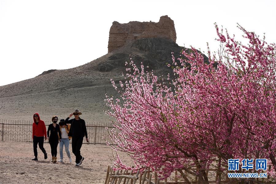4月18日,游客在阳关烽燧遗址附近欣赏桃花。近日,位于甘肃省敦煌市阳关烽燧遗址附近的几株桃树花开正艳,给荒凉的戈壁大漠增添了一抹亮色。新华社记者 马宁 摄