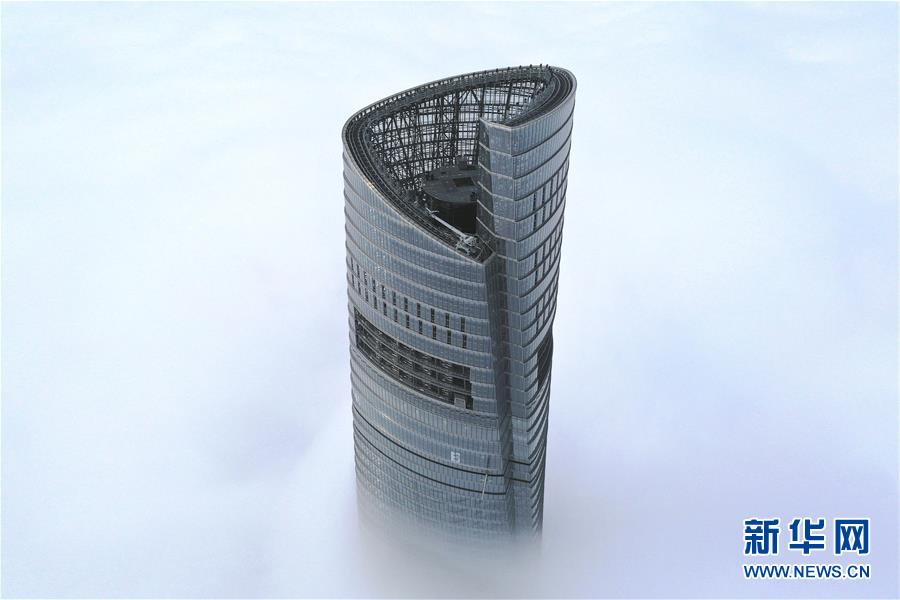 4月19日,上海部分地区出现大雾,上海中心大厦楼顶四周云雾缭绕(无人机拍摄)。新华社发(沈春琛 摄)