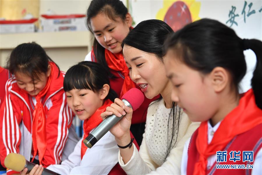 4月18日,谭湘丽为“红领巾”广播站的同学们示范播音。新华社记者 孟鼎博 摄