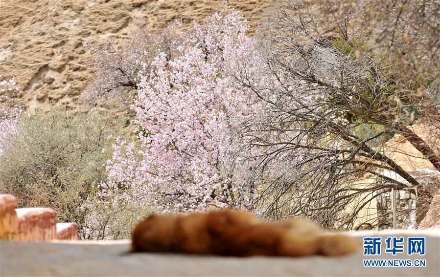 拉萨古刹帕崩岗周围桃花盛开,一只狗悠闲地躺在路上(4月18日摄)。