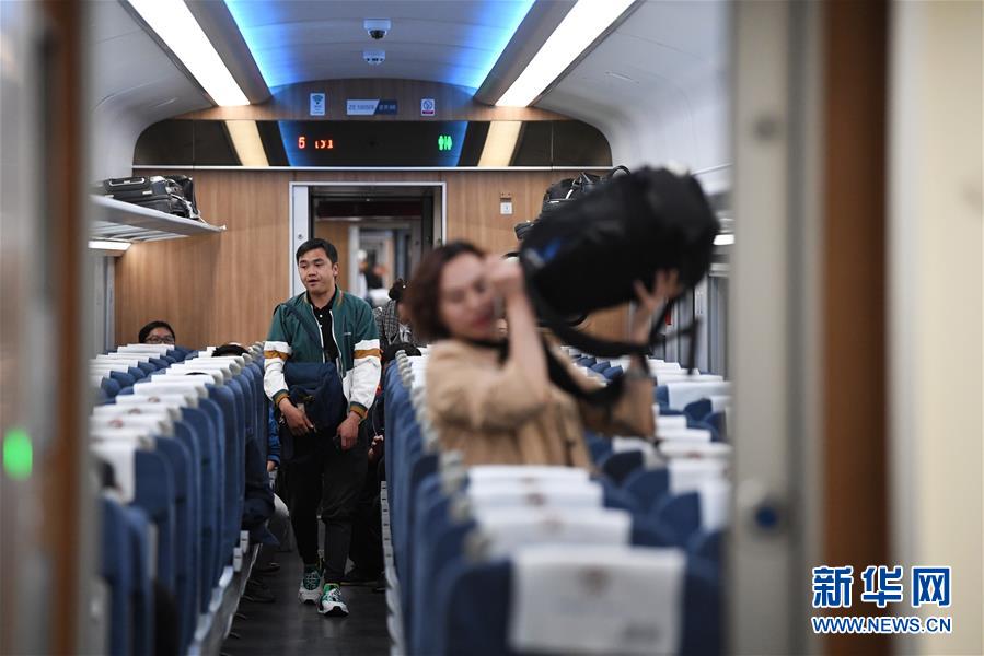 4月19日,旅客登上C8518次动车组列车前往兰州市区。 当日,中国铁路兰州局集团有限公司对城际列车运行图进行调整,将兰州市区至中川国际机场之间运行的动车组列车数量增加到每天18对,发车间隔和运行时间进一步缩短。 新华社记者 陈斌 摄