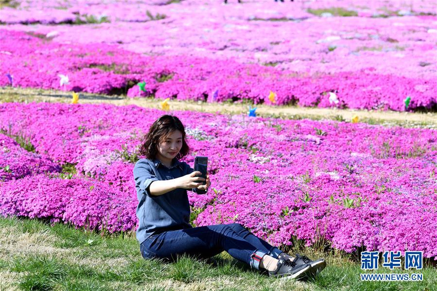 4月19日,游客在霍山县太阳乡船仓村花海里拍照。