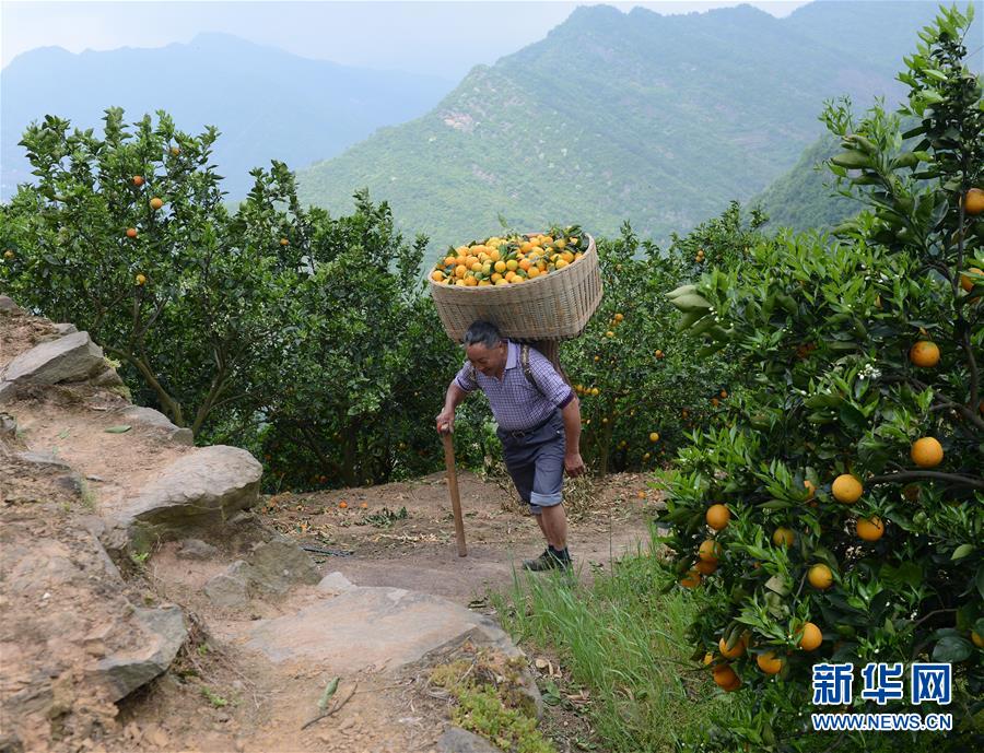 4月19日,秭归县泄滩乡万家村村民在背运收获的夏橙。 眼下,湖北脐橙之乡秭归县的夏橙成熟上市。秭归县的夏橙具有花果同枝、酸甜适度、风味浓郁等特点,是当地为丰富脐橙种类、开展错季销售、调节水果市场而培育的新品种。 新华社发(王辉富 摄)