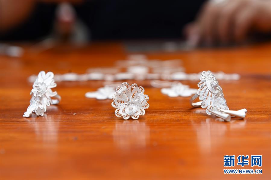 这是银饰工匠展示的参赛作品(4月19日摄)。 当日,贵州黔东南苗族侗族自治州台江县举办“妈妈制造”非遗手工技艺比赛,比赛以银饰、刺绣、扎染等现场创意手工为主要竞赛内容,200余人同场竞技。 新华社发(刘开福 摄)