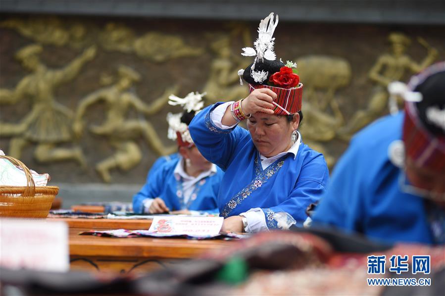 4月19日,在台江县姊妹街,选手参加非遗手工技艺比赛。 当日,贵州黔东南苗族侗族自治州台江县举办“妈妈制造”非遗手工技艺比赛,比赛以银饰、刺绣、扎染等现场创意手工为主要竞赛内容,200余人同场竞技。 新华社发(刘开福 摄)