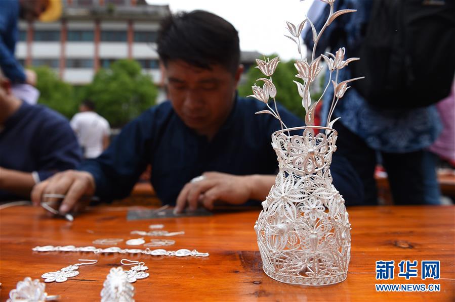 4月19日,在台江县姊妹街,银饰工匠参加非遗手工技艺比赛。 当日,贵州黔东南苗族侗族自治州台江县举办“妈妈制造”非遗手工技艺比赛,比赛以银饰、刺绣、扎染等现场创意手工为主要竞赛内容,200余人同场竞技。 新华社发(刘开福 摄)