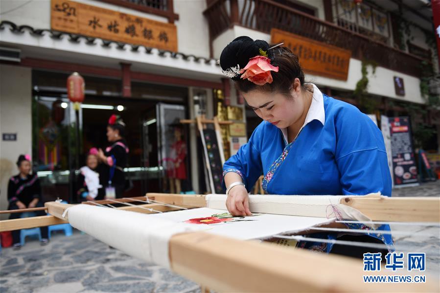 4月19日,在台江县姊妹街,选手参加非遗手工技艺比赛。 当日,贵州黔东南苗族侗族自治州台江县举办“妈妈制造”非遗手工技艺比赛,比赛以银饰、刺绣、扎染等现场创意手工为主要竞赛内容,200余人同场竞技。 新华社发(刘开福 摄)
