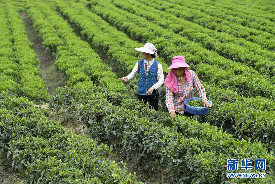 茶叶采摘迎来高峰期,在宣恩县珠山镇王家坳易地扶贫搬迁安置小区拖把生产车间上班的小区居民邓玉春(左)暂别车间,忙着在田间采茶(4月19日摄)。 在湖北省恩施土家族苗族自治州宣恩县,设置在易地扶贫搬迁安置点的“扶贫微工厂”,打破传统按时上下班的模式,结合农村实际探索“错时开工”的管理模式,即通过建立计时、计件、计总工作量等方式,营造出“随时可以来、随时可以走”的宽松工作环境,有效解决农民在农忙、接送孩子等事务上与务工时间相冲突的问题,方便搬迁农民灵活安排时间进厂务工。 新华社发(宋文 摄)