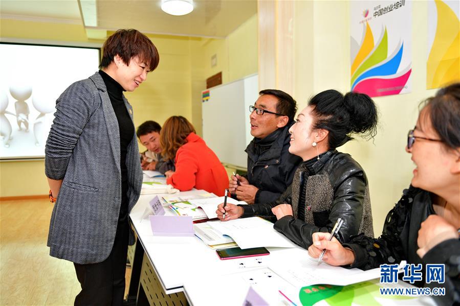 4月19日,培训师祝莉(左)和学员互动。 当日,2019年人社部援藏创业培训师资培训班在拉萨市西藏创新双语职业技能培训学校开班授课。由人社部统一派遣的国家级培训师将对来自西藏全区的60余名学员进行为期十天的培训,助力西藏创业师资队伍水平提升。 新华社记者 张汝锋 摄