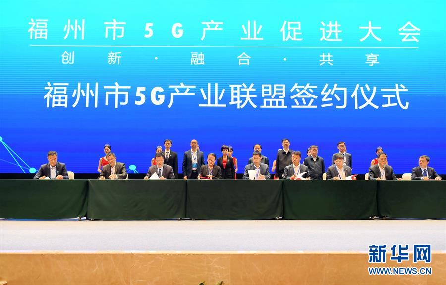 4月19日,福州市5G产业联盟相关企业签署产业合作协议。 当日,以“创新、融合、共享”为主题的福州市5G产业促进大会在福州海峡国际会展中心举行。 新华社记者 林善传 摄