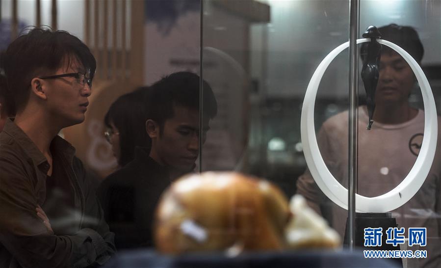 4月19日,观众在展览现场观摩作品。