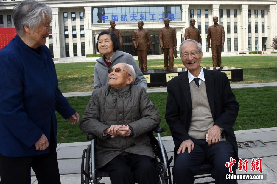 4月19日,在今年“424”的第四个“中国航天日”前夕,中国“航天之父”钱学森与同时期被誉为“航天四老”的任新民、屠守锷、黄纬禄、梁守槃等老一辈航天专家一起阔步向前的全身铜像雕塑群,在位于北京的中国航天科工集团有限公司第二研究院(中国航天科工二院)大楼前落成亮相,这也是中国首座纪念钱老等五位航天元老的铜像雕塑群,旨在缅怀中国航天艰苦卓绝、拚搏奋斗的发展历史,推动青年一代传承航天精神。中国航天科工二院当天组织“航天梦·航天颂”主题活动,并将最新落成的铜像雕塑群命名为“航天梦”,体现中国航天事业经历的启梦、寻梦、追梦、圆梦发展历程。图为著名航天专家、中国工程院院士张履谦(右)等与雕塑群合影。中新社记者 孙自法 摄