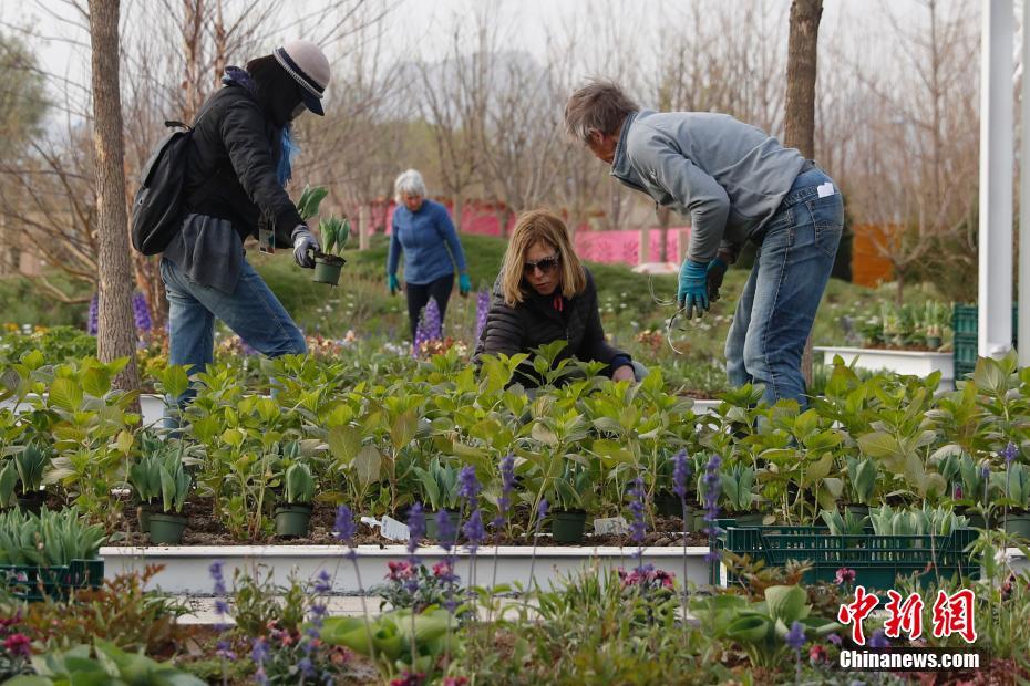 4月19日,工作人员在北京世园会园区内布置花卉。2019年中国北京世界园艺博览会(简称北京世园会)将于4月29日至10月7日在北京延庆举行。本届世园会将有约110个国家和国际组织、120多个非官方参展方参展。中新社记者 韩海丹 摄