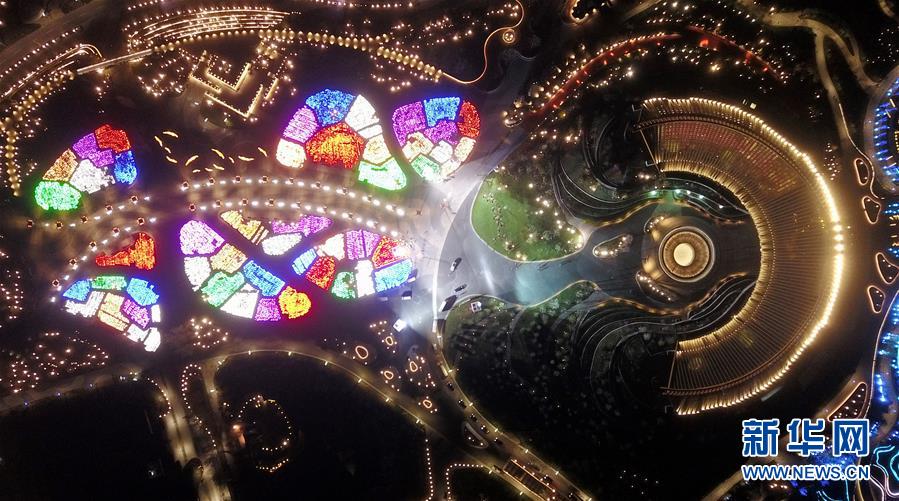 4月18日无人机拍摄的中国馆夜景。 随着2019北京世园会临近开幕,世园会园区内的主要建筑已全面完工。群山脚下、妫水之畔,从白天到夜晚,世园会园区仿佛一幅多彩画卷,向世人徐徐展开。 新华社记者 陈晔华 摄