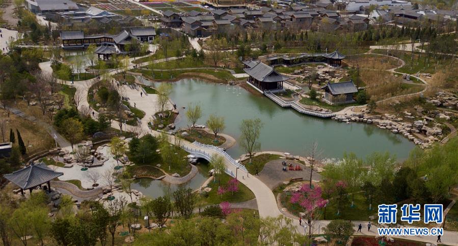 4月19日无人机拍摄的北京世园会园区。 随着2019北京世园会临近开幕,世园会园区内的主要建筑已全面完工。群山脚下、妫水之畔,从白天到夜晚,世园会园区仿佛一幅多彩画卷,向世人徐徐展开。 新华社记者 侯东涛 摄
