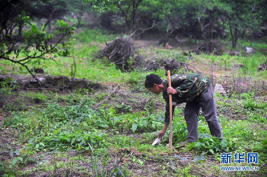 2013年5月14日,龙飞振在给李树苗施肥。新华社记者 黄孝邦 摄