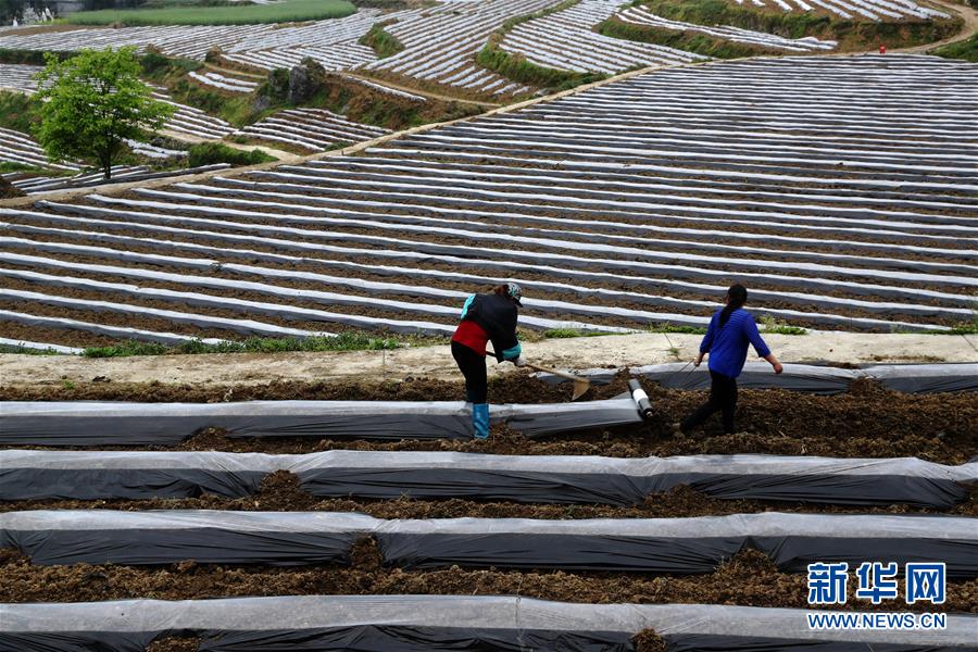 4月20日,在重庆市黔江区邻鄂镇松林村一处金丝皇菊种植基地,村民在覆盖栽植金丝皇菊的农膜。新华社发(杨敏 摄)