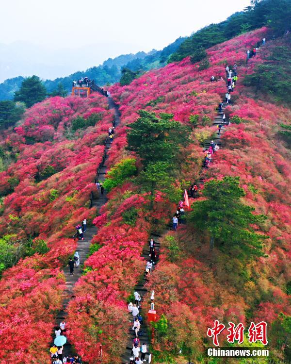 4月20日,游客在龟峰山的杜鹃花海游玩。近日,湖北省麻城市龟峰山的古杜鹃花盛开,大量游客前来赏花观景。中新社记者 汪立敏 摄
