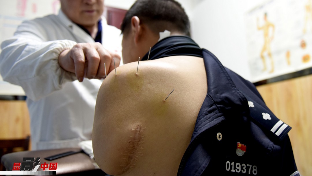 2012年以来,他主办各类刑事案件70余起,处理治安案件800余起,为群众挽回经济损失近400万元。图为鲍志斌利用中午休息时间通过中医针灸缓解胳膊疼痛。