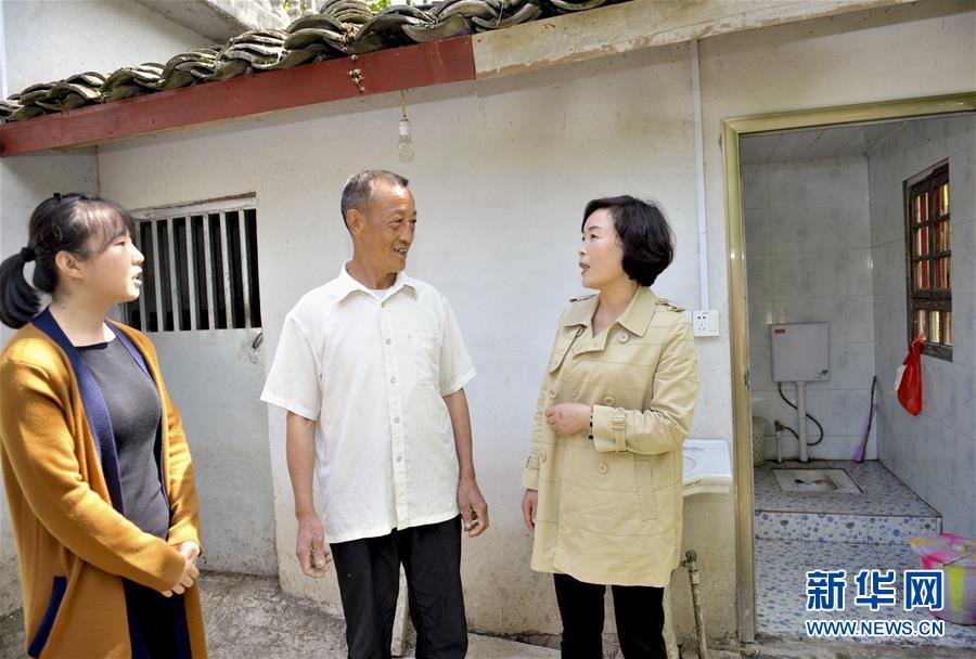 汉中市城固县爱国卫生运动委员会办公室工作人员(右)在二里镇勤俭村村民肖仕贵(中)家了解卫生改厕基本条件(4月17日摄)。目前,勤俭村正在进行农户卫生改厕工作,以提升村庄人居环境。 新华社记者陈海通摄