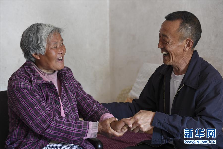 汉中市城固县二里镇勤俭村村民肖仕贵在家与老伴陈元芝聊天,帮她按摩手臂(4月17日摄)。 新华社记者陶明摄