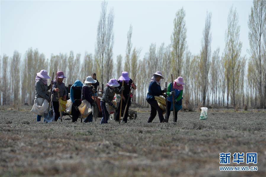 新疆霍城县芦草沟镇的农民在给薰衣草施肥(4月4日摄)。 新华社发(丁磊 摄)