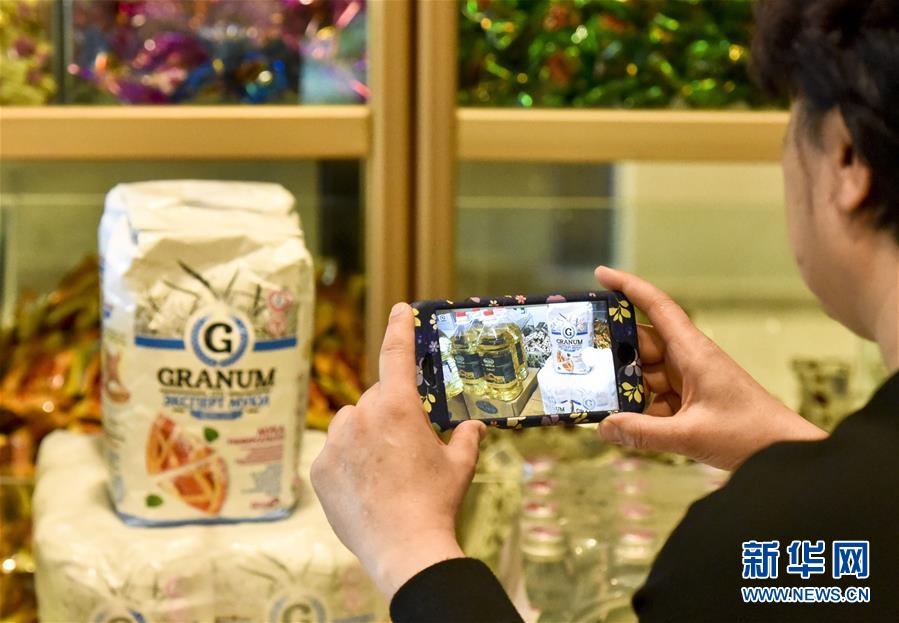 2017年4月12日,在新疆乌鲁木齐市,西域特产进口食品批发商城一家食品店的店主给店内的哈萨克斯坦清油和面粉拍照,准备用微信发给南疆的批发商。