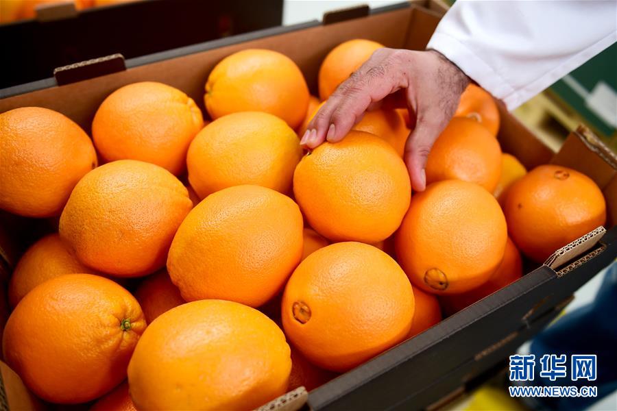 2018年1月18日,在埃及布海拉省的一家水果包装厂内,工人在检查分装完毕的鲜橙。