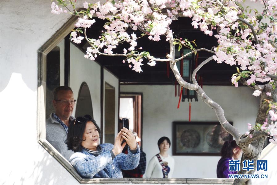 2019年4月1日,游客在中国苏州网师园内拍照。1997年,网师园和拙政园、留园、环秀山庄被列入联合国教科文组织世界文化遗产名单。 新华社记者杜涓涓摄