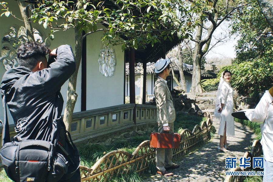 2019年4月1日,一对夫妻在中国苏州沧浪亭内拍婚纱照。2000年,沧浪亭和艺圃、耦园、狮子林、退思园作为苏州古典园林的扩展项目被列入联合国教科文组织世界文化遗产名单。 新华社记者杜涓涓摄