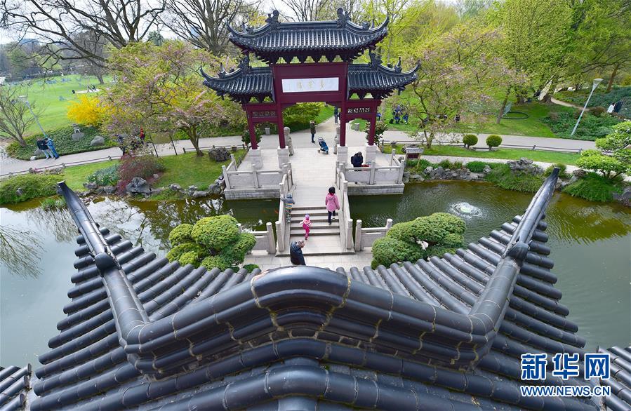 2019年4月13日,在德国曼海姆,游客在中式园林“多景园”内游玩。“多景园”位于曼海姆市路易森公园内,占地约6000平方米,建筑面积约1500平方米,是目前欧洲最为完整的中国古典园林建筑群落之一。 新华社记者逯阳摄