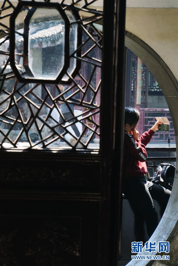 2019年4月1日,游客在中国苏州网师园内自拍。1997年,网师园和拙政园、留园、环秀山庄被列入联合国教科文组织世界文化遗产名单。 新华社记者杜涓涓摄