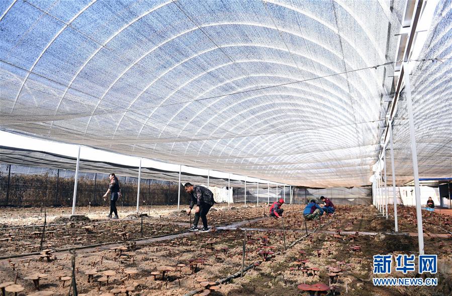 红旗村农民在温室种植大棚里采摘灵芝(4月15日摄)。新华社记者 林宏 摄