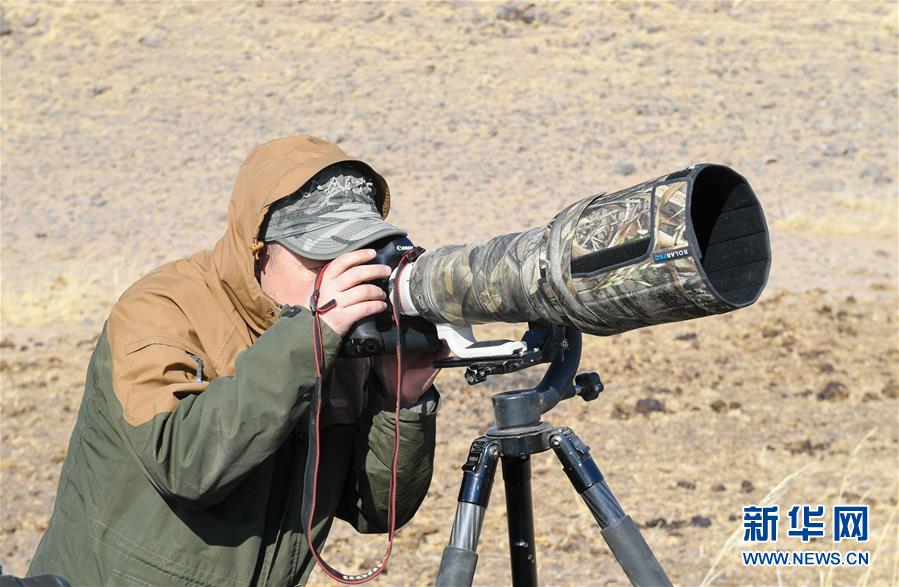 双龙在呼伦湖畔的草原上拍摄猛禽(4月12日摄)。