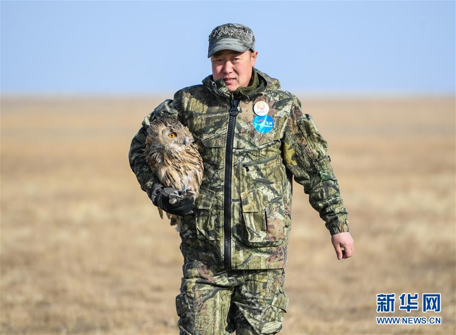 在呼伦湖畔,双龙带着救助的雕鸮做野外放生训练(4月13日摄)。新华社记者 彭源 摄