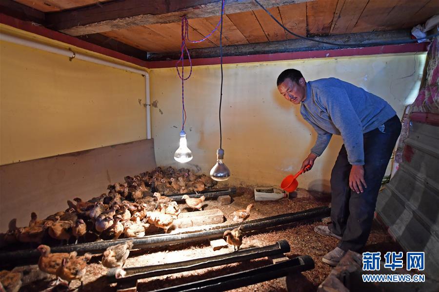 布巴村村民拉珠在自家鸡舍里喂鸡(4月13日摄)。新华社记者 李鑫 摄