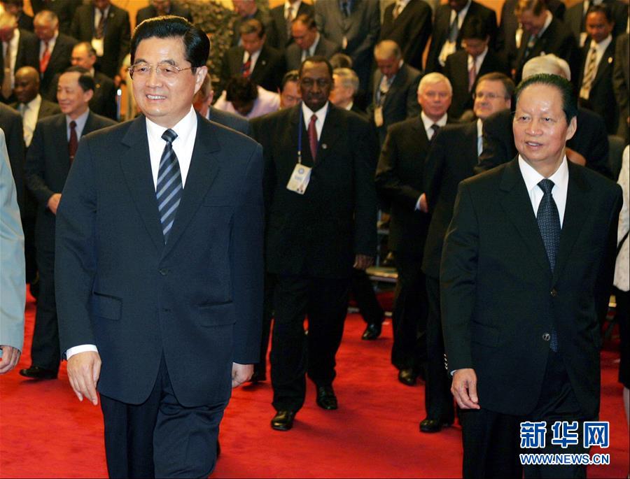 2005年9月5日,肖扬同志陪同胡锦涛同志会见第22届世界法律大会部分代表。新华社发