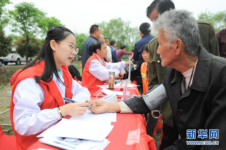 4月23日,志愿者为村民提供义诊服务。 当日,安徽省肥西县2019年文化科技卫生“三下乡”活动在铭传乡启明社区举行。来自全县文化、科技、卫生等部门的志愿者为村民带来一场文艺演出,并开展义诊、科普等活动。 新华社记者 任鹏飞 摄